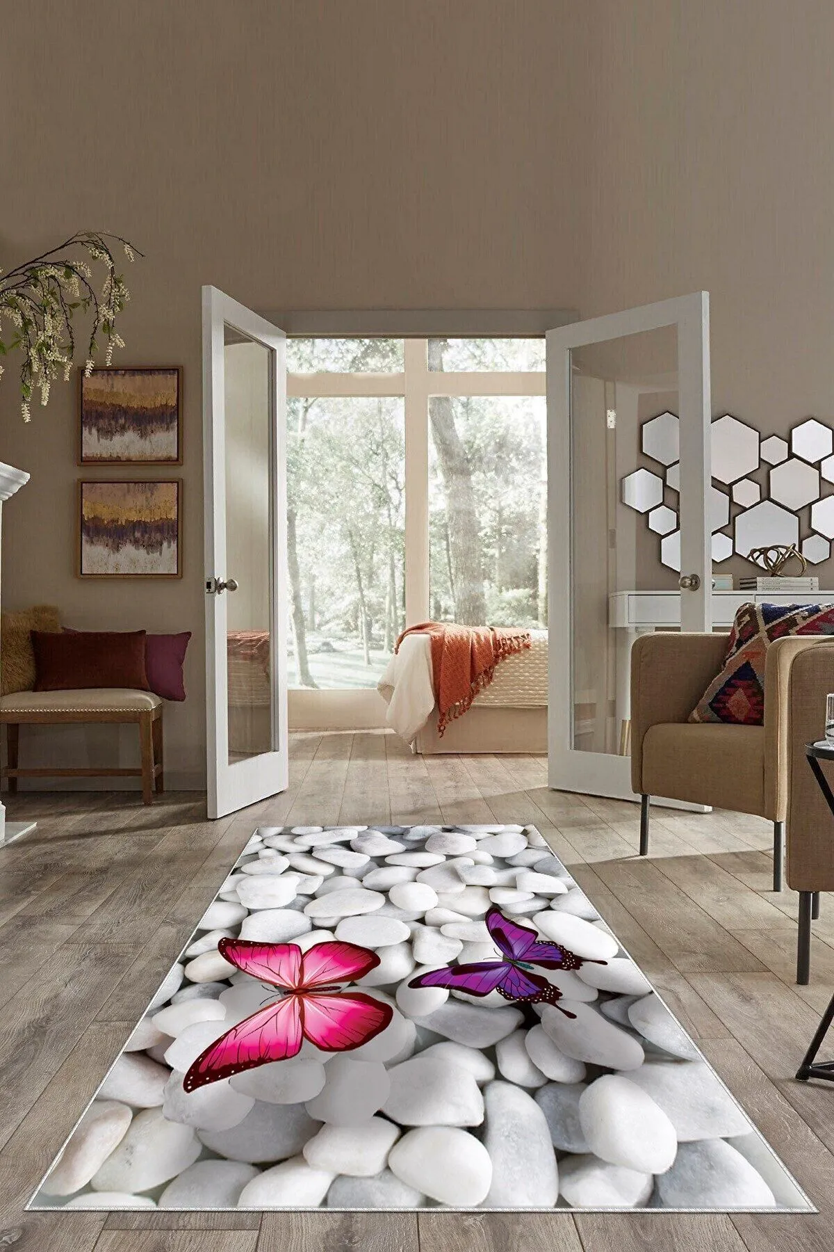- Beyaz Taş Desenli Kelebekli Yıkanabilir Kaymaz Taban Leke Tutmaz Modern Salon Halısı ve Yolluk Hav Yüksekliği: 7-8 mmdir.