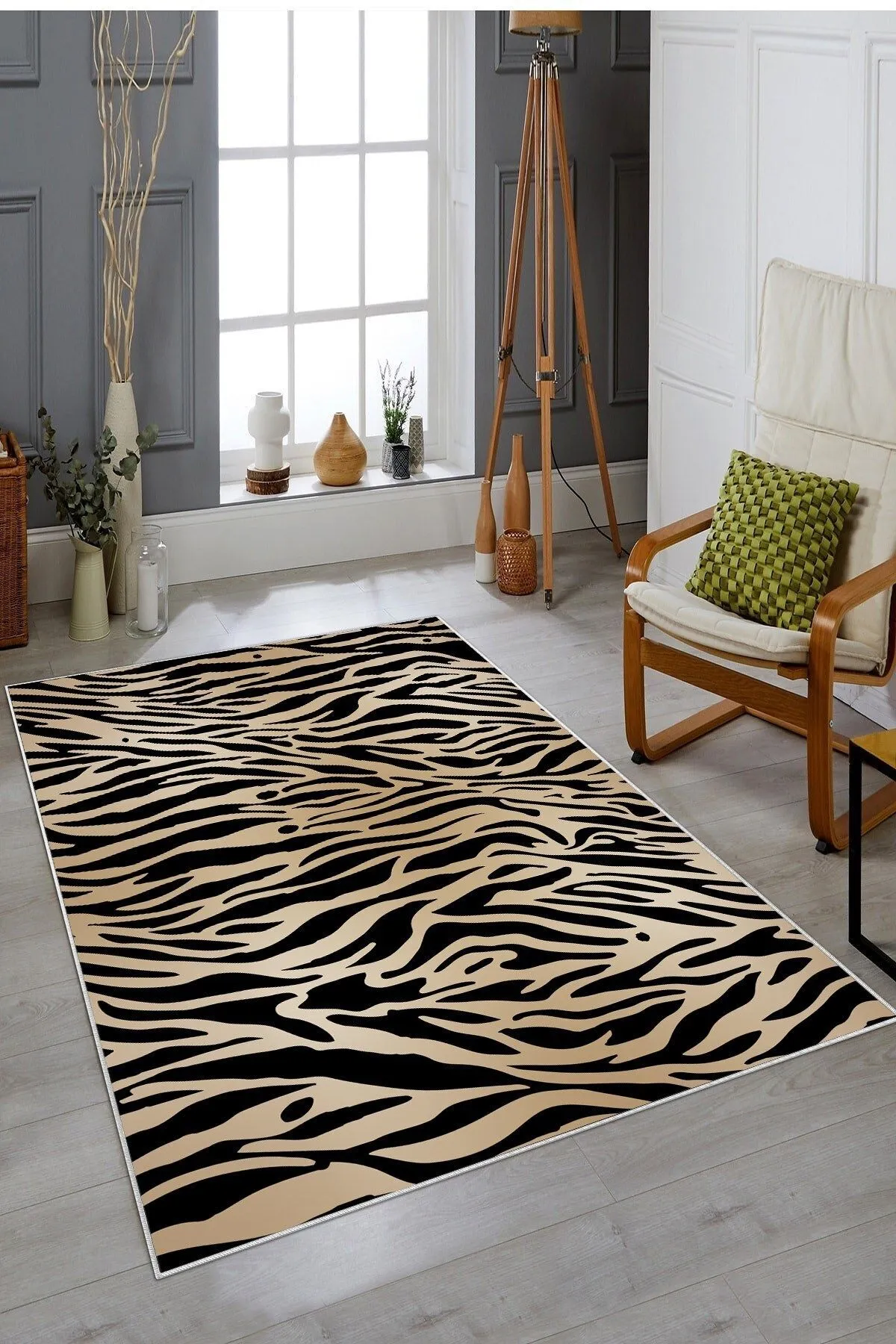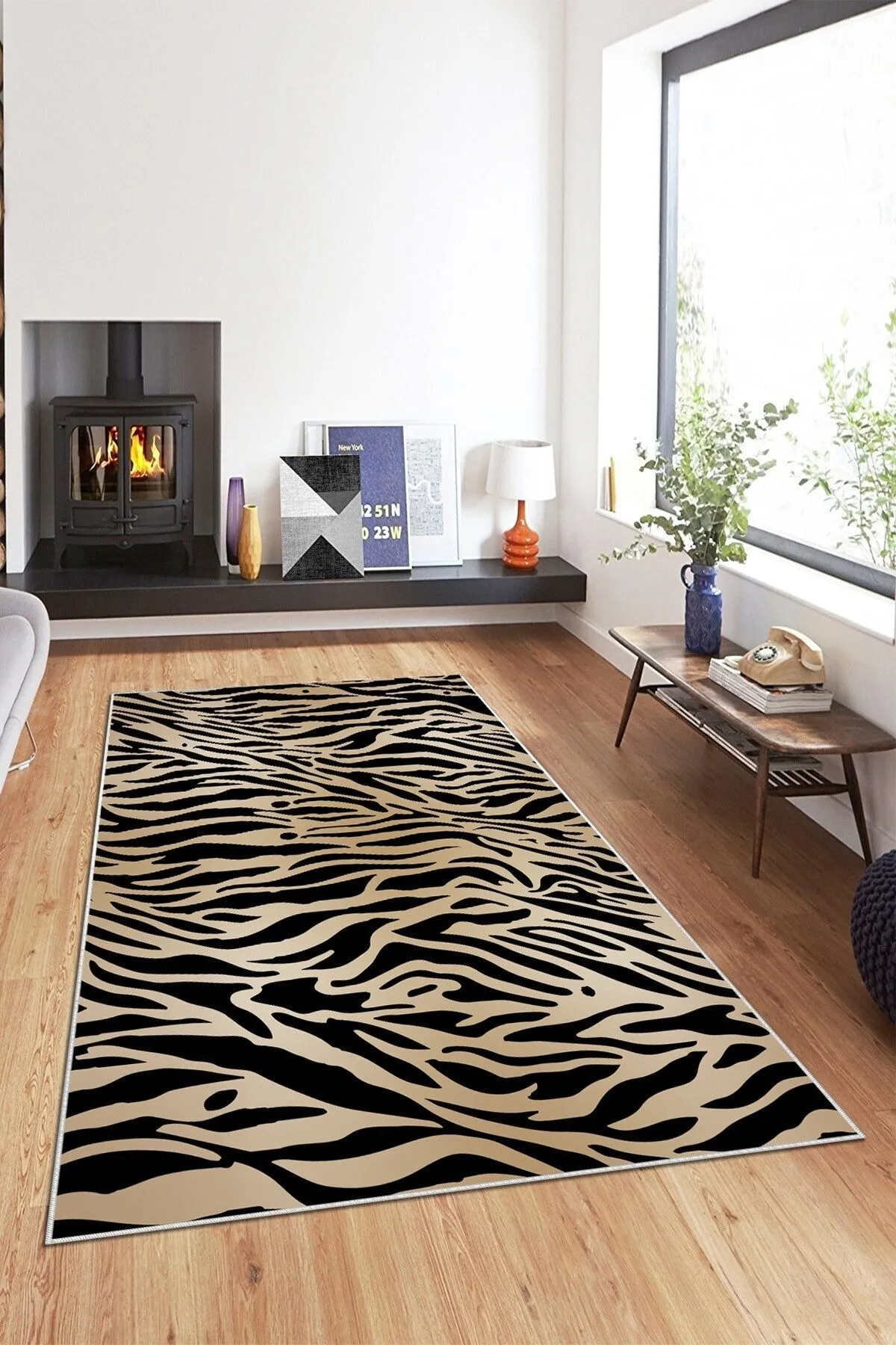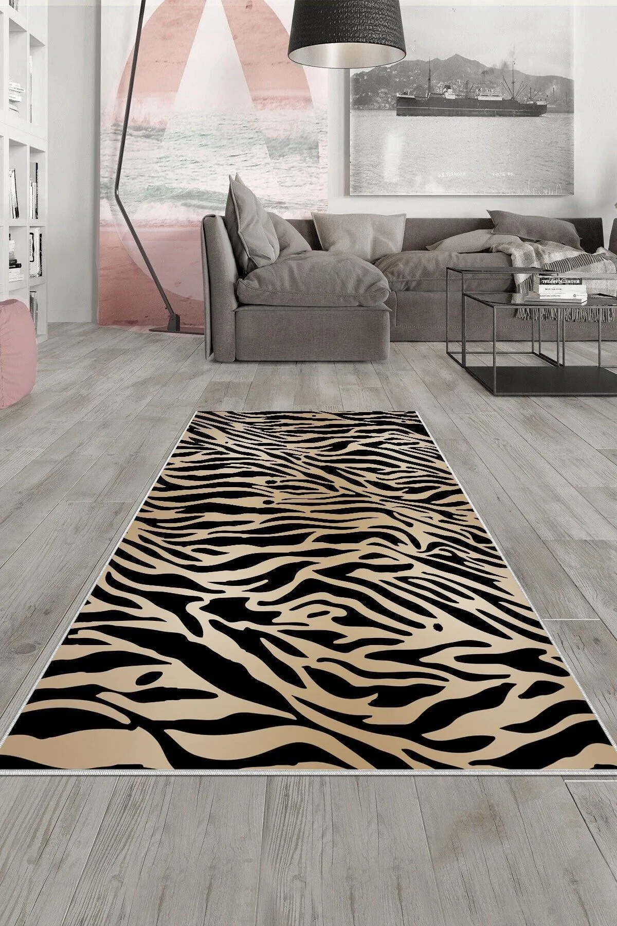 Siyah Leopar desenli Yıkanabilir Kaymaz Taban Leke Tutmaz Modern Salon Halı Yolluk